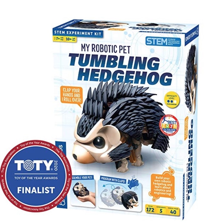 Build your own adorable robotic pet hedgehog! With the 172 building pieces in this kit, you can assemble a real robot that looks like a cute hedgehog. The robot has a built-in sound sensor and is programmed to react to different sounds. After you build it, you can play with it by making different sounds and watching it tumble, roll, spin around, bristle its spines, and scurry around. Clap once, and the hedgehog will roll into a ball and tumble backwards. Clap multiple times, and the hedgehog will count your claps and tumble as many times as you instructed with your claps. You can also get the hedgehog to bristle its spines and act in a playful way with different patterns of claps. The hedgehog’s eyes light up with LEDs. By building the robot, you will gain experience in the inner mechanical workings that enable the robot to move how it does. Learn about gears, motors, sound sensors, LEDs, and the other components of this funny little pet. AGES 7+ MSRP: $39.95.