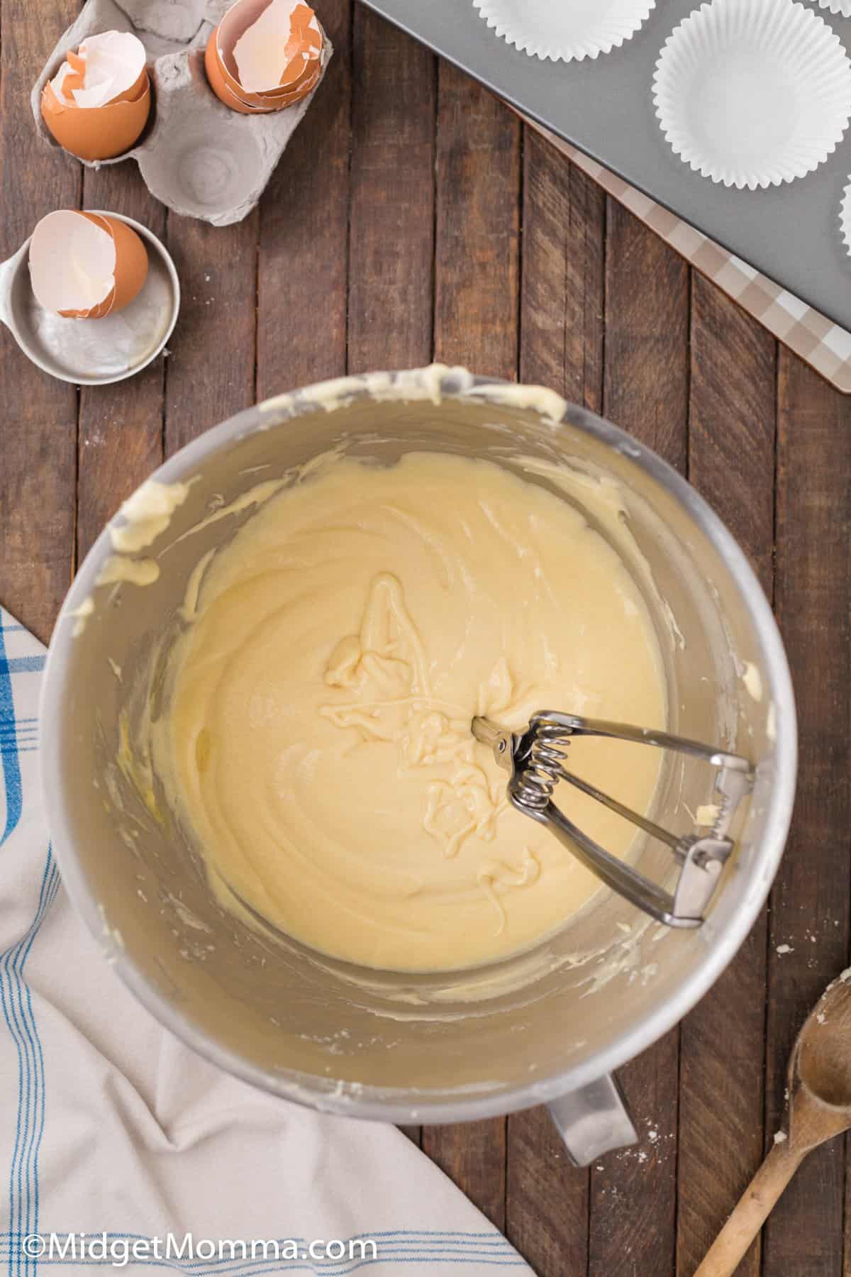 - Scoop the batter into the prepared cupcake pan, filling them 3/4 of the way full.