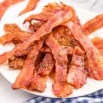 Crispy bacon with topped with brown sugar and then baked in the oven makes for the perfect oven baked bacon. Baked Brown sugar bacon, also known as candied bacon and pig candy is easy to make. Fresh bacon is topped with brown sugar and then baked in the oven until crispy while the brown sugar is caramelized in the process. The sweet and salty combination makes candied bacon the perfect breakfast side dish or party appetizer.