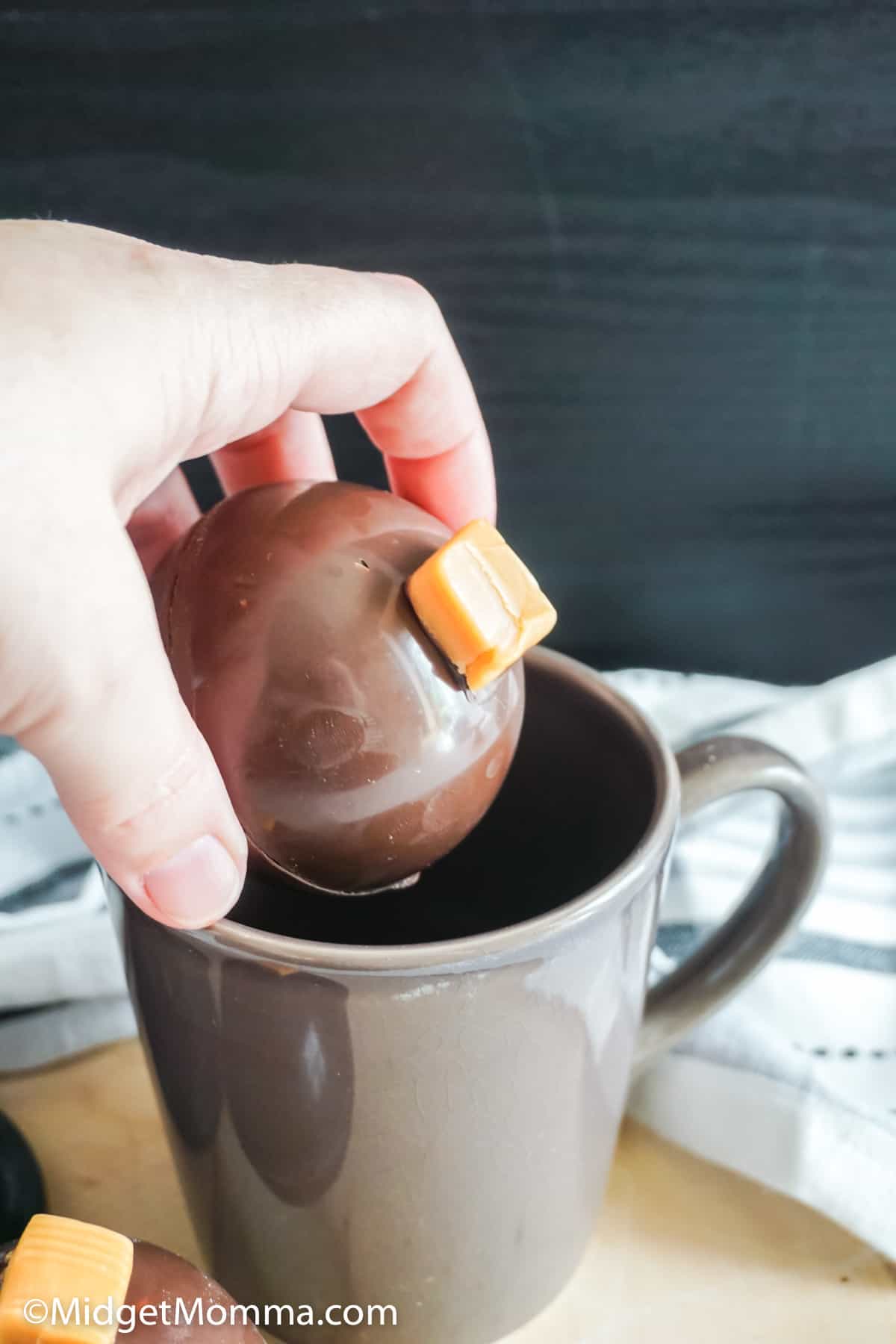 - With the reserved chocolate, dip the bottom of the cut side of a caramel into the melted chocolate then immediately place this candy on top of a hot cocoa bomb. Repeat with the remaining hot cocoa bombs