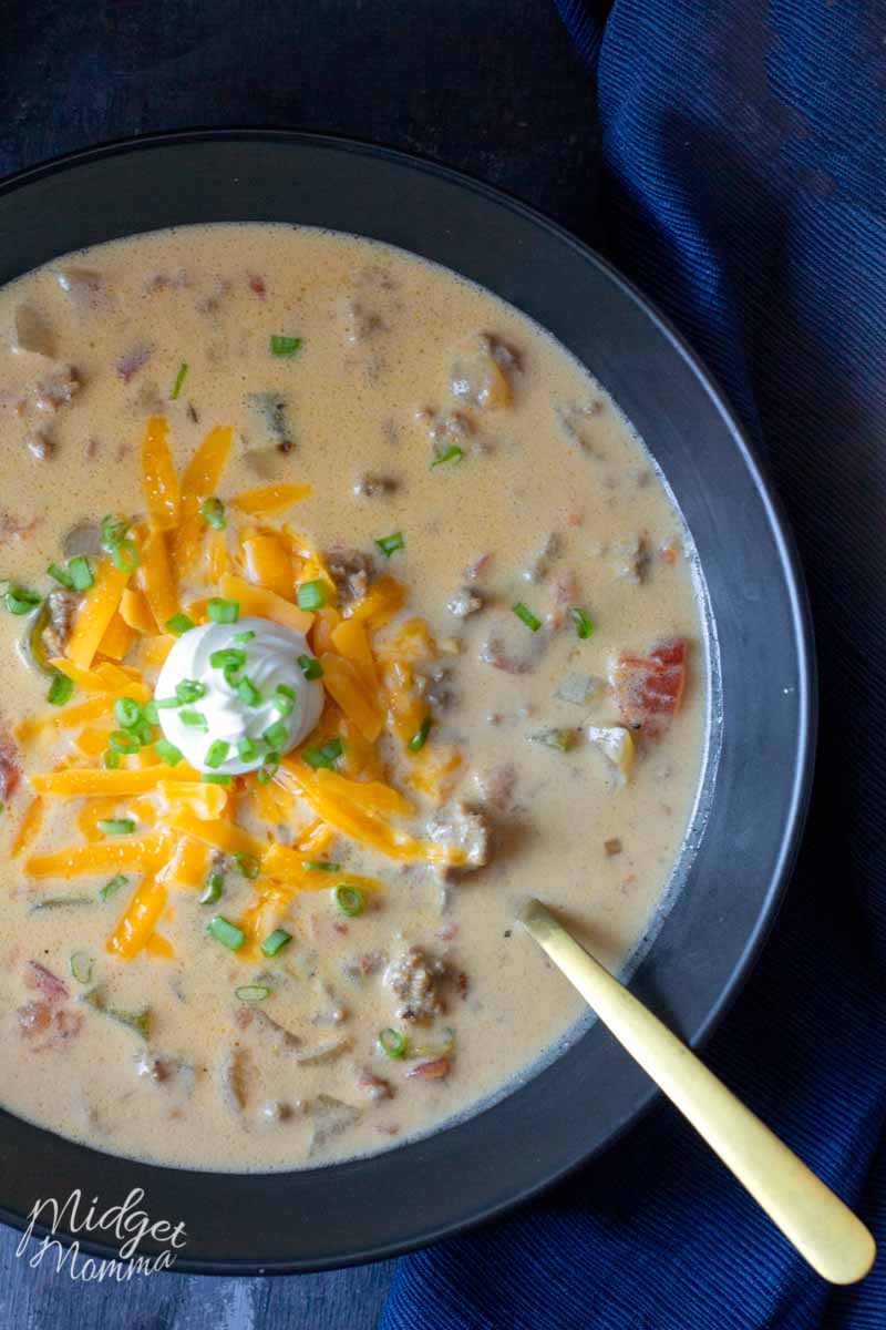 To keep this a low carb and keto friendly soup recipe I make this cheeseburger soup without potatoes, although when I made it previously to being low carb and keto I did put potatoes in my soup.
