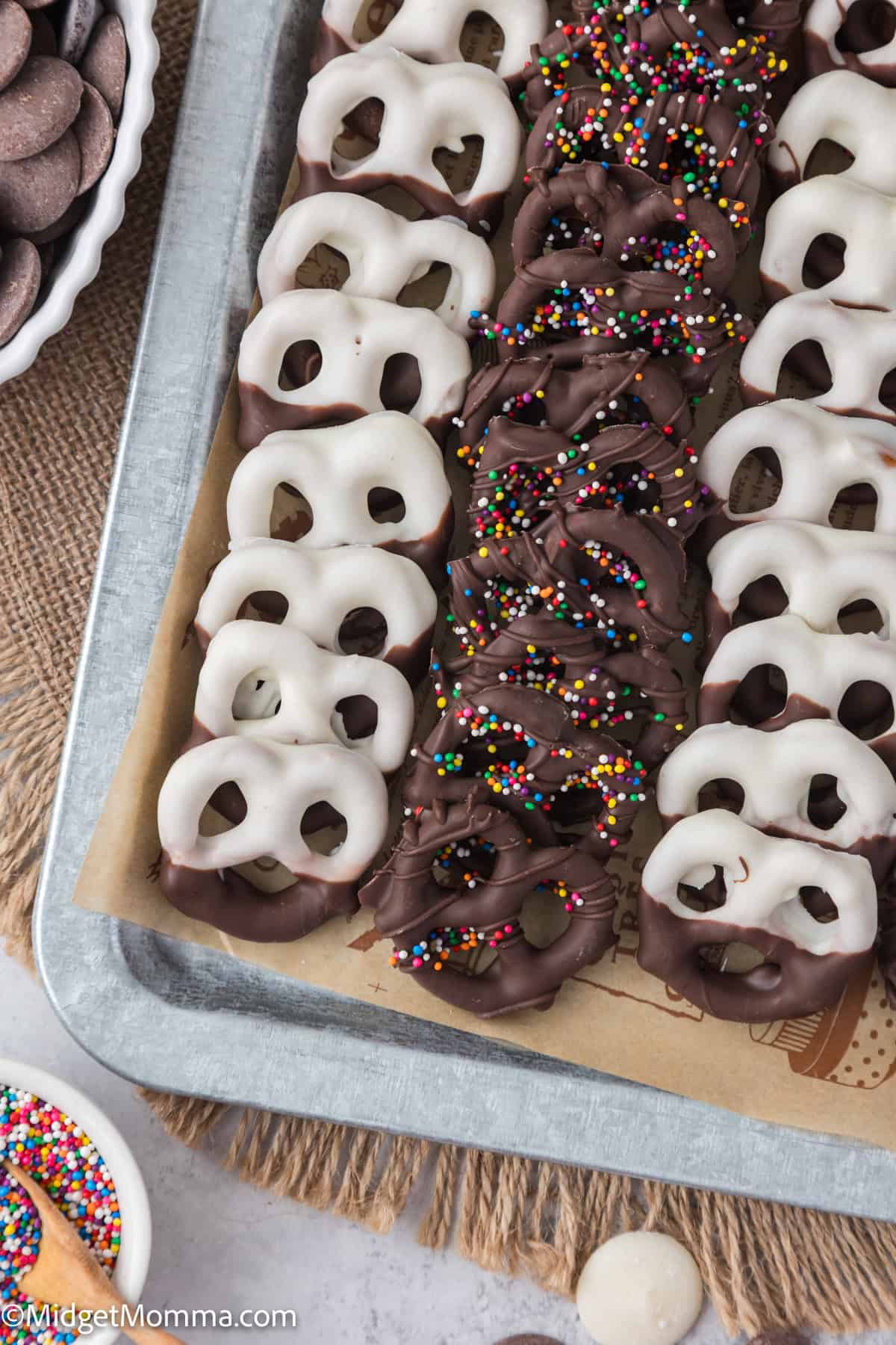 - Allow the dipped pretzels to sit at room temperature until the chocolate or candy coating is fully set. To speed up the process, you can place the baking sheet in the refrigerator for about 5-10 minutes.