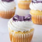 - After frosting the cupcakes add a fondant bow on top of each cupcake.