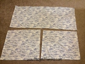 You need to measure the length of the longest side, lengths of the two shortest sides, and height when the mattress is at its highest setting. My crib was 51 1/2 for the longest side, 27 1/2 inches for the sides and 19 inches high. You will need to add about two inches to the height measurement and add an inch to all the measurements for a seam allowance. Cut three rectangles of fabric, mine were one 52 1/2 by 21 inches and two 29 1/2 by 21 inches.