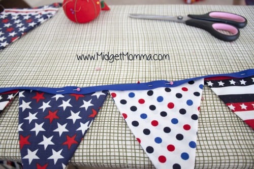 To make your pattern cut a piece of cardboard so its nine inches in length and eight inches wide. Cut that into a triangle. Using your fabric pen mark you fabric and cut them out. Take two triangles and place them right sides facing together. Sew the two long sides together but leaving the top open. Repeat with all the other triangles. Turn them all right side out and iron them flat. Place your pendants inside your bias tape being sure the shorter side of the tape is up. I place the pendants so they are end to end. Then sew down the bias tape, stitching close to the edge.