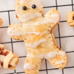 Change up how you make the mummy. There are 2 ways to make the handpie look like a mummy. You can top the mummy with either another mummy cut out and then use a knife to make 3-4 small slits on the top and use a fork to press together the outside edges of the mummy. Or cut strips using the excess pie crust and cross the small strips on top of the jam covered cut outs to make it look like a mummy.