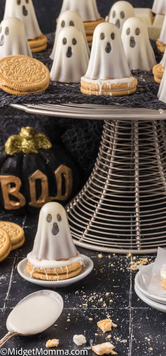 - Optional – place a small amount of melted chocolate on an Oreo cookie and adhere ghost to cookie.