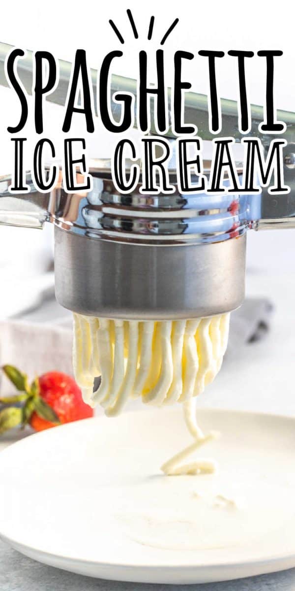 - Over a plate squeeze the ice cream with the help of the potato ricer and swirl it a little to make it look like spaghetti noodles. Add the other 1.5 cups of ice cream and do the same on a second plate.