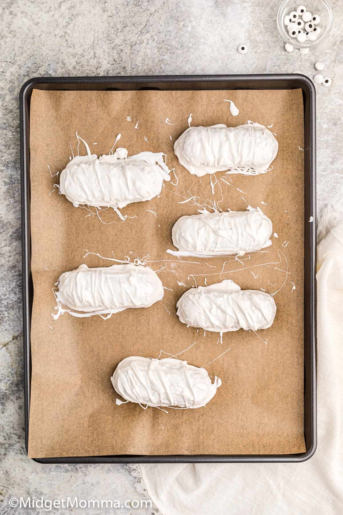 I rebought the twinkies like 3 times and got smart the third time by hiding the box. However that also meant when I went to make these Twinkie Mummies I heard “What! You didn’t tell me you bought Twinkies!”. Yes Tom you are right I didn’t tell you because I wanted to make Twinkie Mummies and I was tired of going to the store and rebuying them.