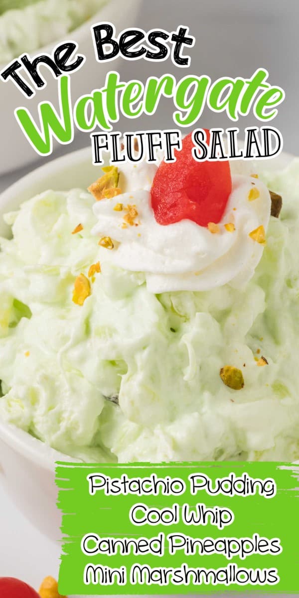 The traditional Watergate Salad, also known as Pistachio Fluff Salad, typically contains Instant pistachio pudding mix, canned pineapple, mini marshmallows, and whipped topping such as cool whip.