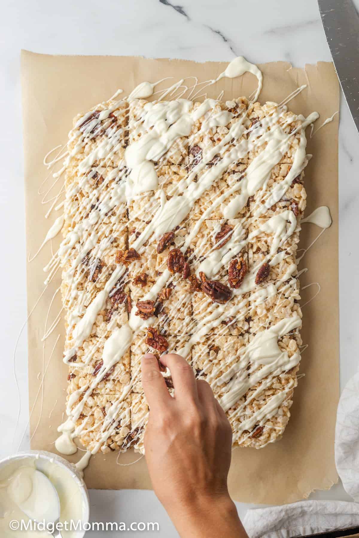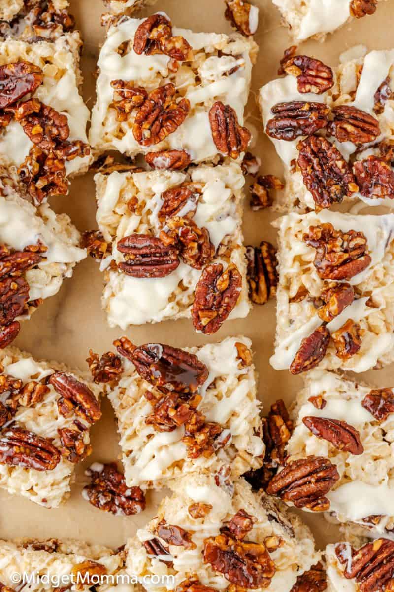 Candied Pecan Rice Krispie Treats. Soft and chewy rice krispie treats topped with candied pecans and a drizzle of white chocolate for an amazing easy rice krispie treat.