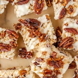 If you are looking for a fancy rice krispie treat recipe then you are going to love these. All the awesomeness of a traditional rice krispie treats fancied up with some candied pecans and a drizzle of white chocolate. Oh yum!